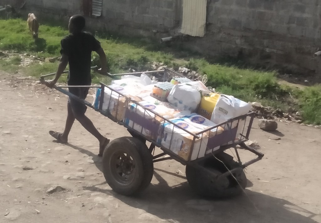 Solomon kaufte jede Menge Mehl, Zucker, Maismehl, Öl und auch Getränke und lud die Familien ein, die Lebensmittel, die uns mit einem Karren zu Schule geliefert wurden, dort abzuholen.