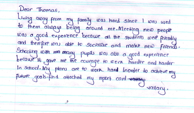 Vallary ist die Klassenbeste und lernt viel und fleißig. Sie hat Bestnoten in Englisch, Suaheli und Geographie. Auch Lennon gibt sich größte Mühe und ein starker Schüler im oberen Fünftel seiner Klasse. Seine größten Stärken liegen auch im Geographie- und im Chemieunterricht. Wir sind superstolz auf unsere Großen.
