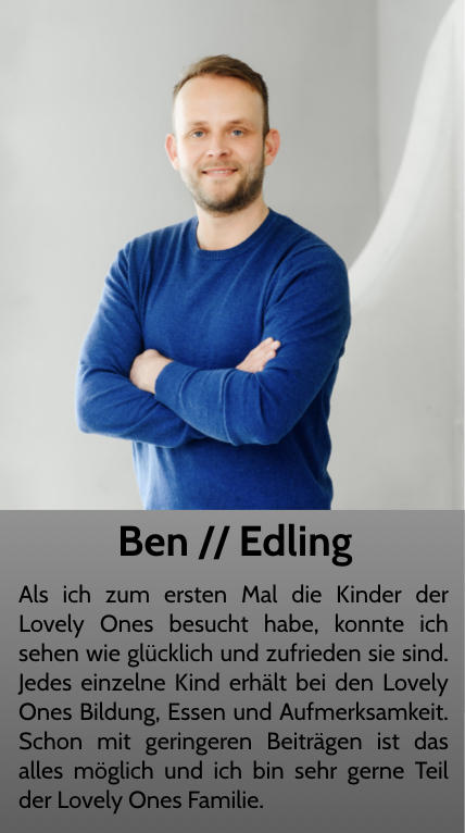 Über 6000 km Entfernung halten wir ständig Kontakt, unterstützen, beraten, motivieren und nehmen Anteil am Leben der Lovely Ones. Wir – das ist ein bunt zusammengewürfelter Haufen von Leuten, die gerne helfen und gerne teilen. Wir sind die Fürsprecher und Unterstützer der Lovely Ones. Wir wollen unsere Begeisterung und unser Herz für die liebenswerten Kinder nach außen tragen und teilen.